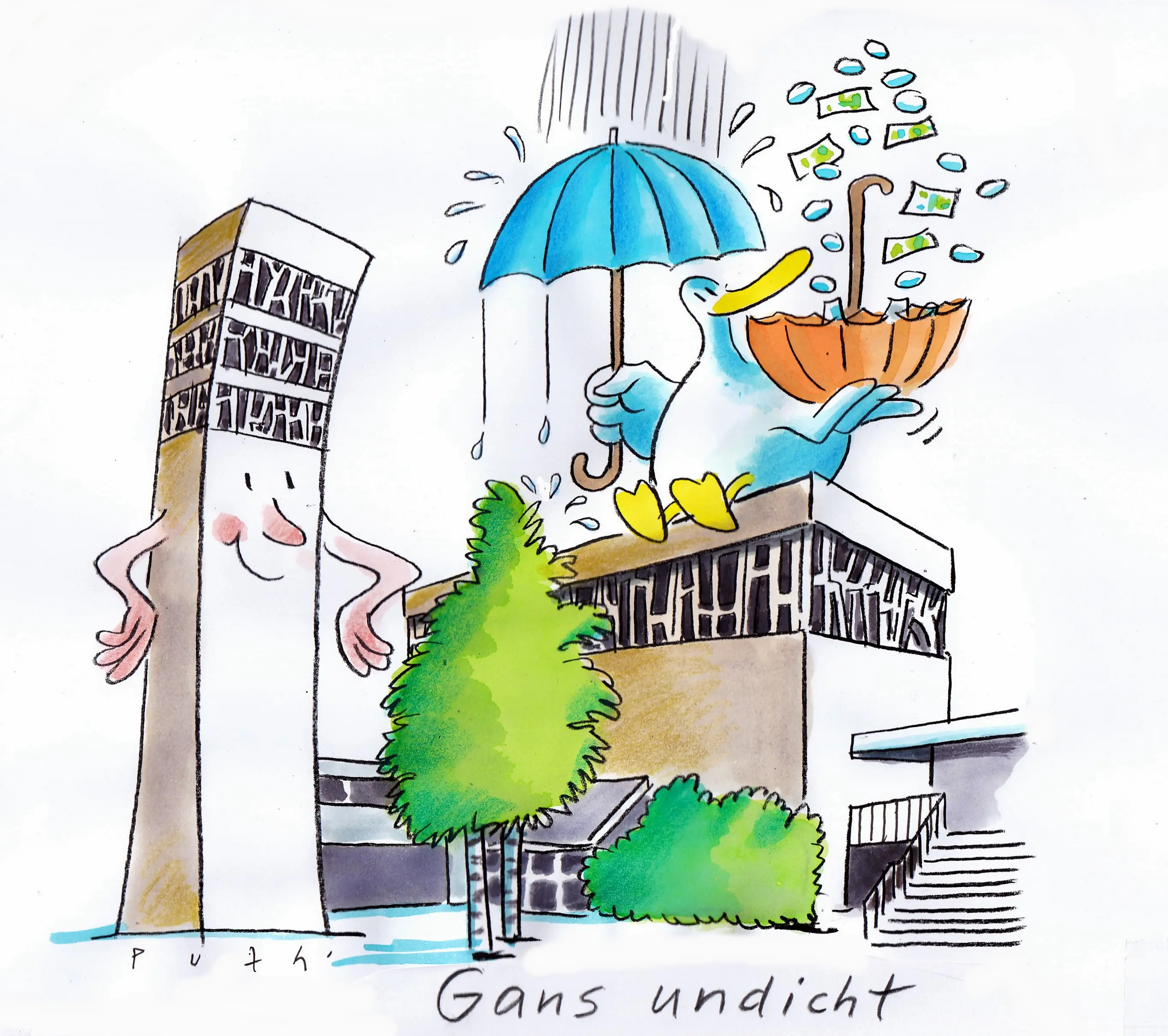 Wir sind sehr stolz darauf, unser Gemeindemitglied und über die Stadtgrenzen hinaus bekannten Künstler, Klaus Puth dafür gewinnen zu können uns mit seiner legendären Gans auf diesem Weg zu begleiten. "Gans undicht" untertitelt der Cartoon zu recht und wir hoffen sehr, dass auch uns ein Geldregen bevorsteht.